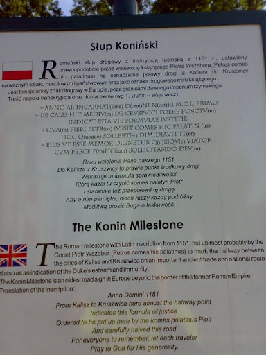 * Słup Koniński – najstarszy znak drogowy  w Europie Środkowo-Wschodniej. Mieści się przy kościele św. Bartłomieja na konińskiej Starówce. Inskrypcja na nim głosi, że został ufundowany przez komesa Piotra Włostowica? w 1151 r. Pierwotnie (do 1828 r.) umiejscowiony był w okolicach konińskiego zamku na obecnym Pl. Zamkowym, dawniej zwanym Rynkiem Garncarskim. Wskazywał połowę drogi z Kalisza do Kruszwicy. Na 2010 r. zaplanowano jego renowację.