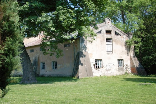 Przed pałacem rozciąga się owalny trawnik, po jego prawej stronie znajduje się oficyna, a po lewej spichlerz i stajnia.